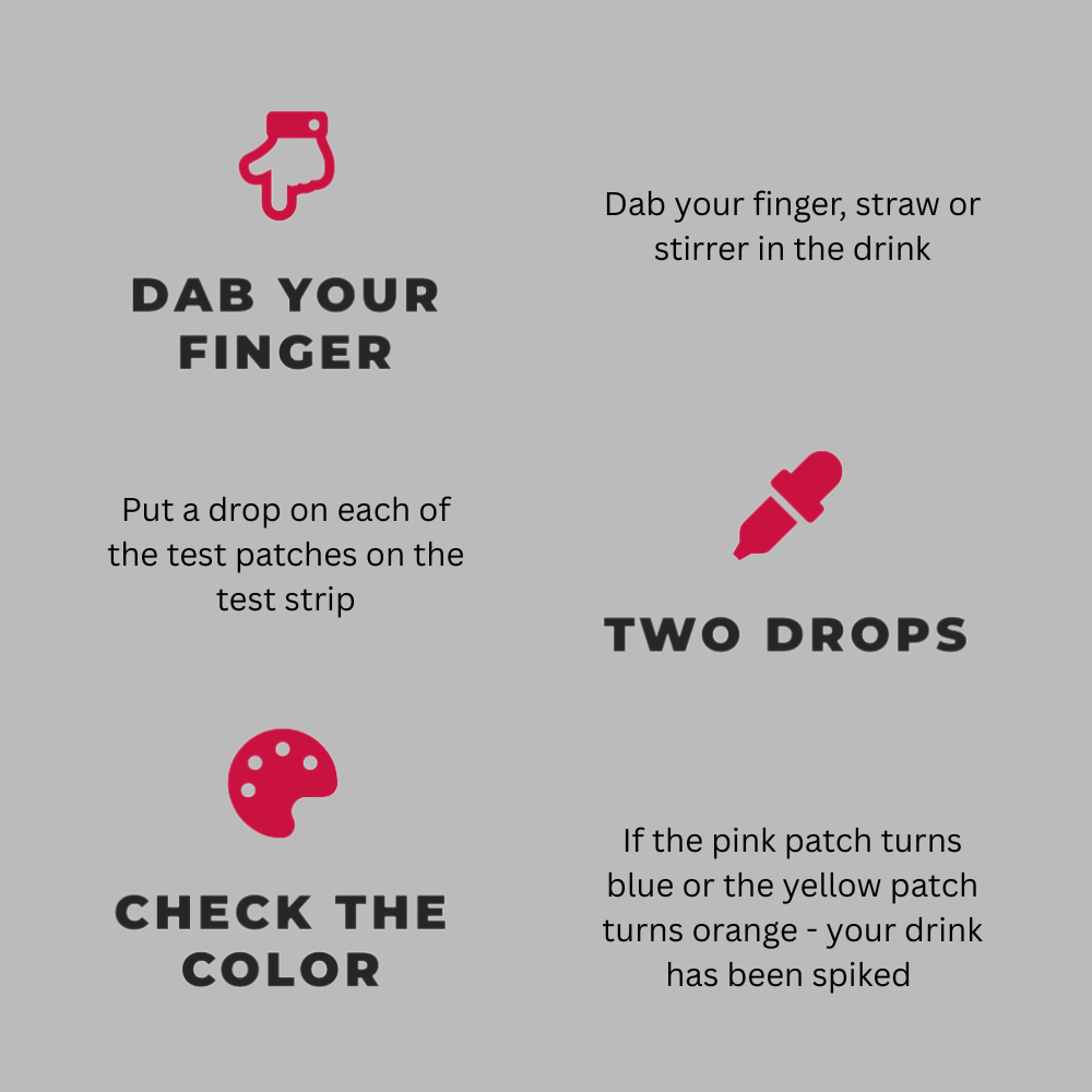 Each strip is easy to use, with a compact design that fits easily into your wallet, clutch or pocket. Just apply a drop of your drink to the test areas and check for any colour change.